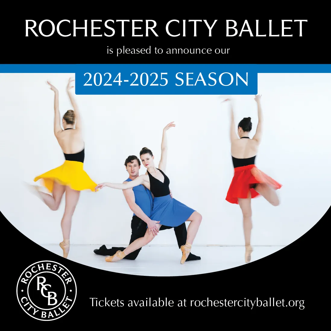 ROCHESTER, NY – Rochester City Ballet is proud to present performance details for their upcoming 2024-2025 season. Experience beloved traditions, riveting world premieres, and inspiring stories of love, unison, and magic in a season in which the future of the company is defined. Honoring their history and celebrating a promising future, Rochester City Ballet’s 37th year is filled with the best of classical and contemporary ballet, showcasing the incredible versatility of the artists. Our 24-25 season continues to uphold the reputation of Rochester City Ballet as a leader in the arts community.